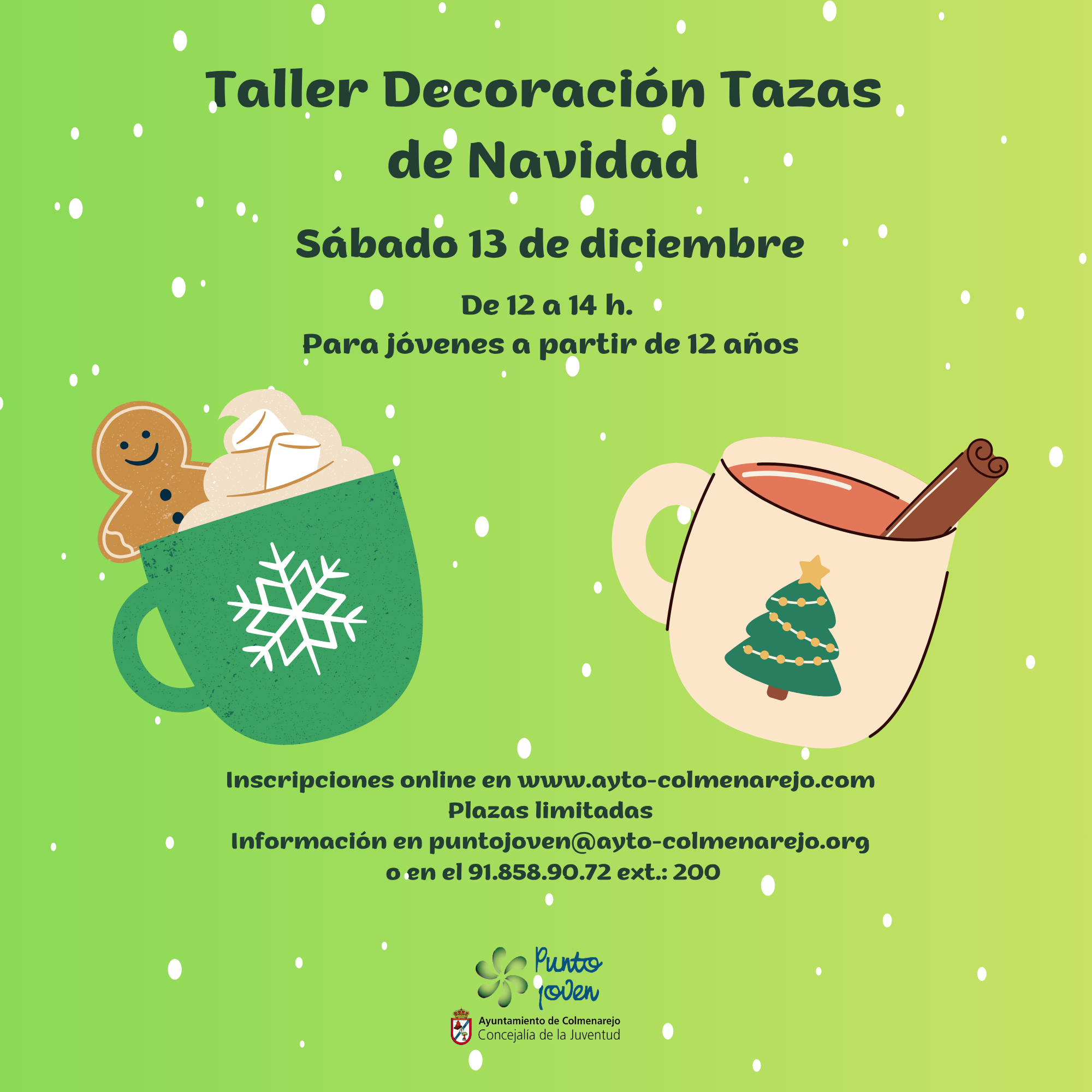 Os presentamos una nueva propuesta del Punto Joven para realizar algo diferente con motivo de la Navidad. Se trata de un Taller de Decoración de Tazas de Navidad que se realizará el 13 de diciembre de 12 a 14 h. Está dirigido a jóvenes a partir de 12 años y las plazas son limitadas. Puedes inscribirte AQUí