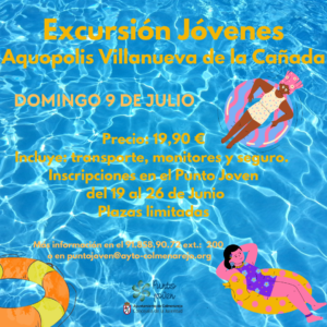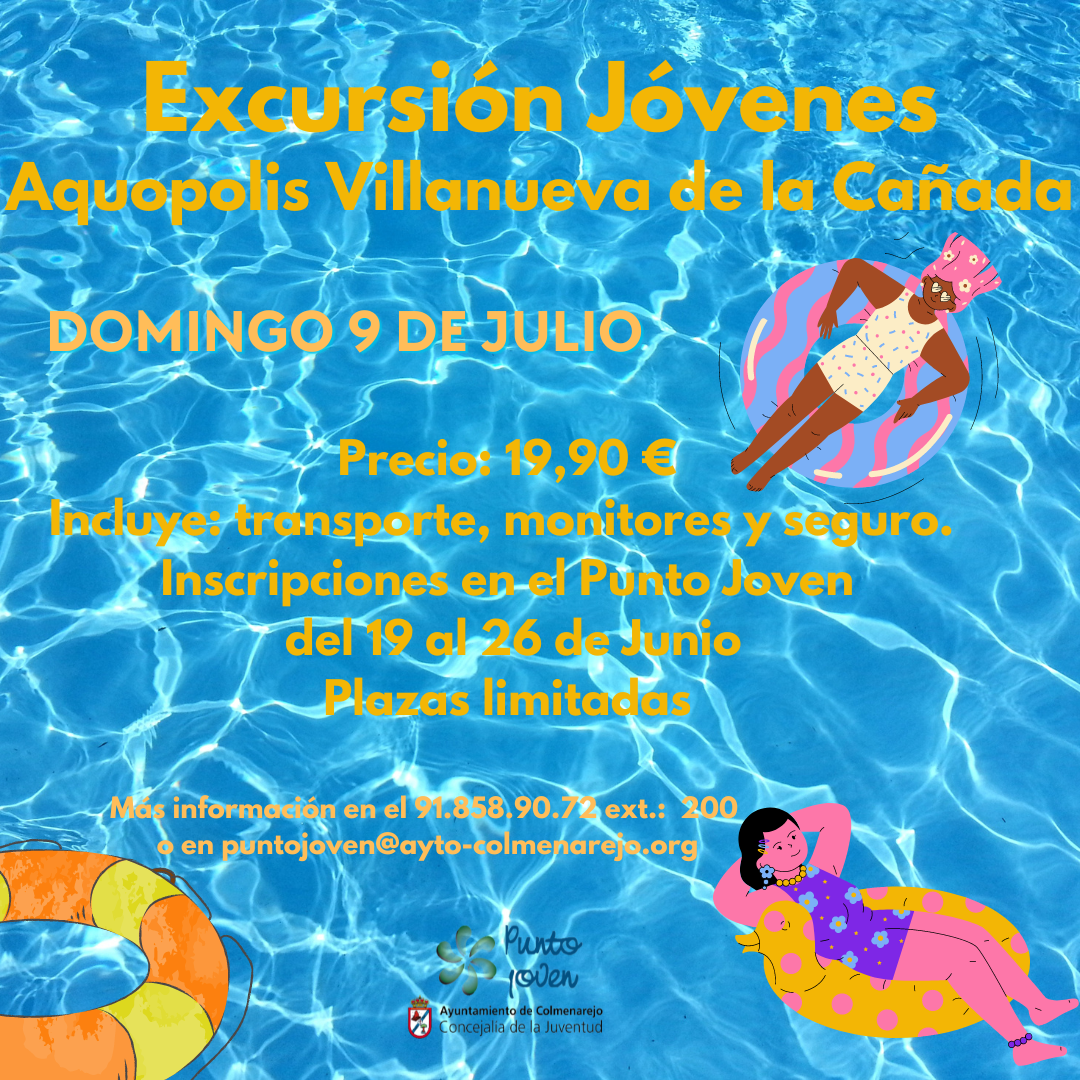 El domingo 9 de julio ven con el Punto Joven al Aquopolis de Villanueva de la Cañada. Salida de Colmenarejo a las 11.30 h. y regreso a las 19.30 h. Para jóvenes a partir de 12 años o que cumplan 12 años en 2023. Precio de la entrada al Aquopolis: 19.90 €. Incluye: monitores, seguro y transporte. Inscripciones en el Punto Joven en horario de atención al público del 19 al 26 de junio. Plazas limitadas, tendrán prioridad los empadronados en Colmenarejo.