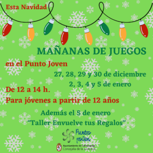 🎄🎁 Los días 27, 28, 29 y 30 de diciembre y 2, 3, 4 y 5 de enero ven al Punto Joven a pasar las mañanas de las vacaciones con tus amigos. Para jóvenes a partir de 12 años, de 12 a 14 h.