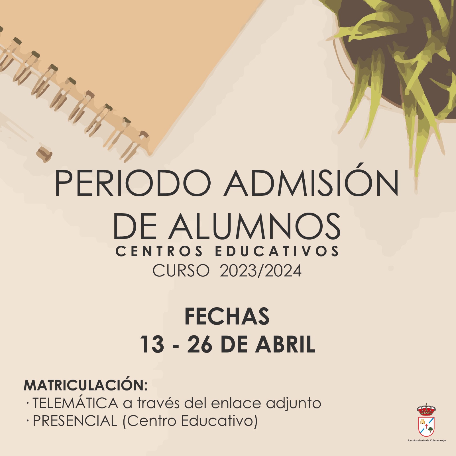 Próximamente se abrirá el PERIODO ADMISIÓN DE ALUMNOS CENTROS EDUCATIVOS correspondiente para el CURSO 2023/2024.