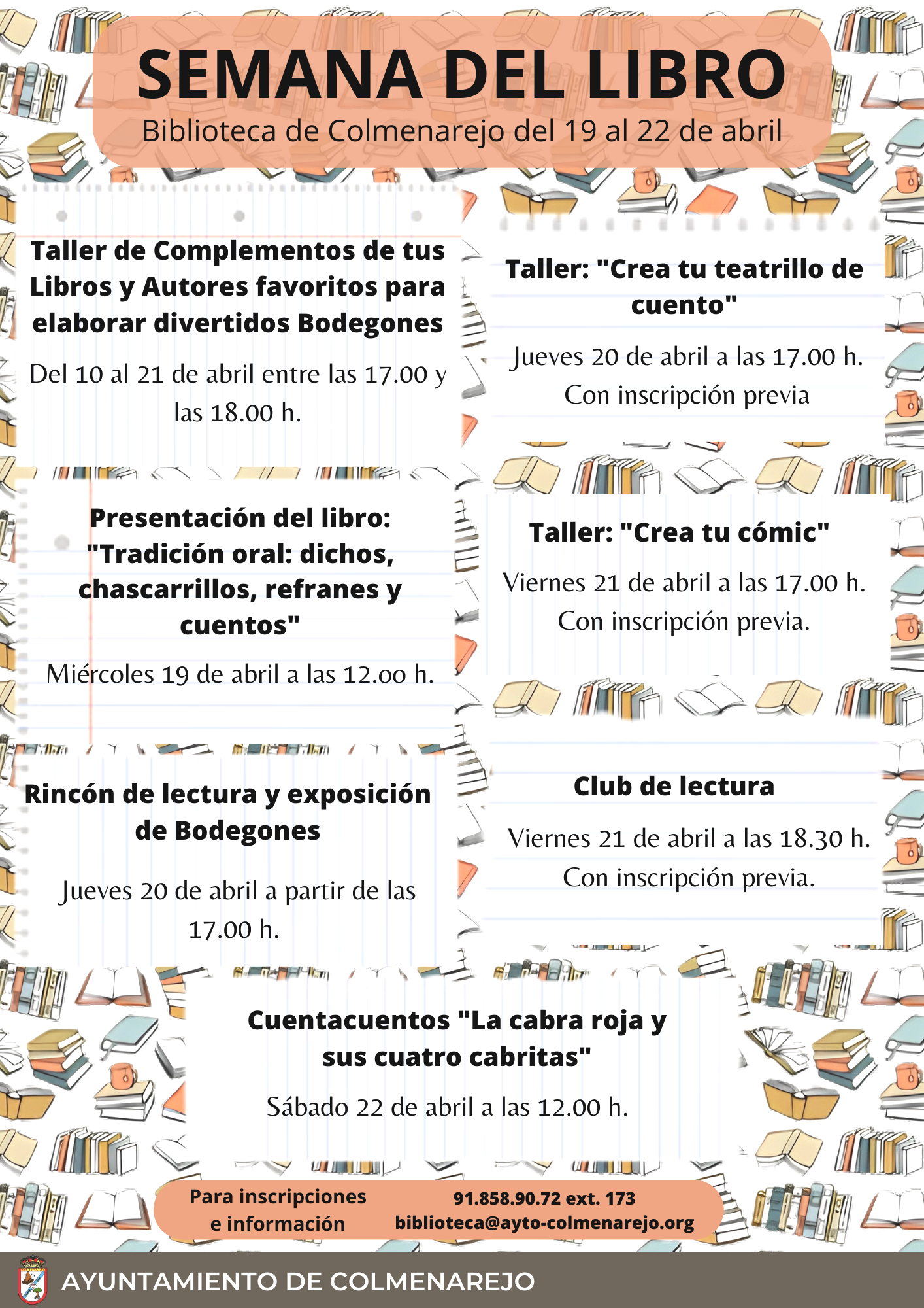 Taller: “Crea tu teatrillo de cuento”. También el jueves 20 de abril a partir de las 17:00h. Fomento del libro y la lectura a través de la creación de unos teatrillos inspirados en cuentos. Con inscripción previa en la Biblioteca.