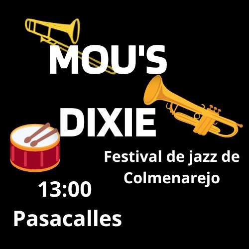 El dixieland, el jazz m谩s tradicional viene de la mano de la Mou’s dixie que nos trasladar谩n a otra 茅poca y convertir谩n las calles de Colmenarejo en el New Orleans de la sierra de Madrid donde todo el mundo est谩 invitado a bailar.