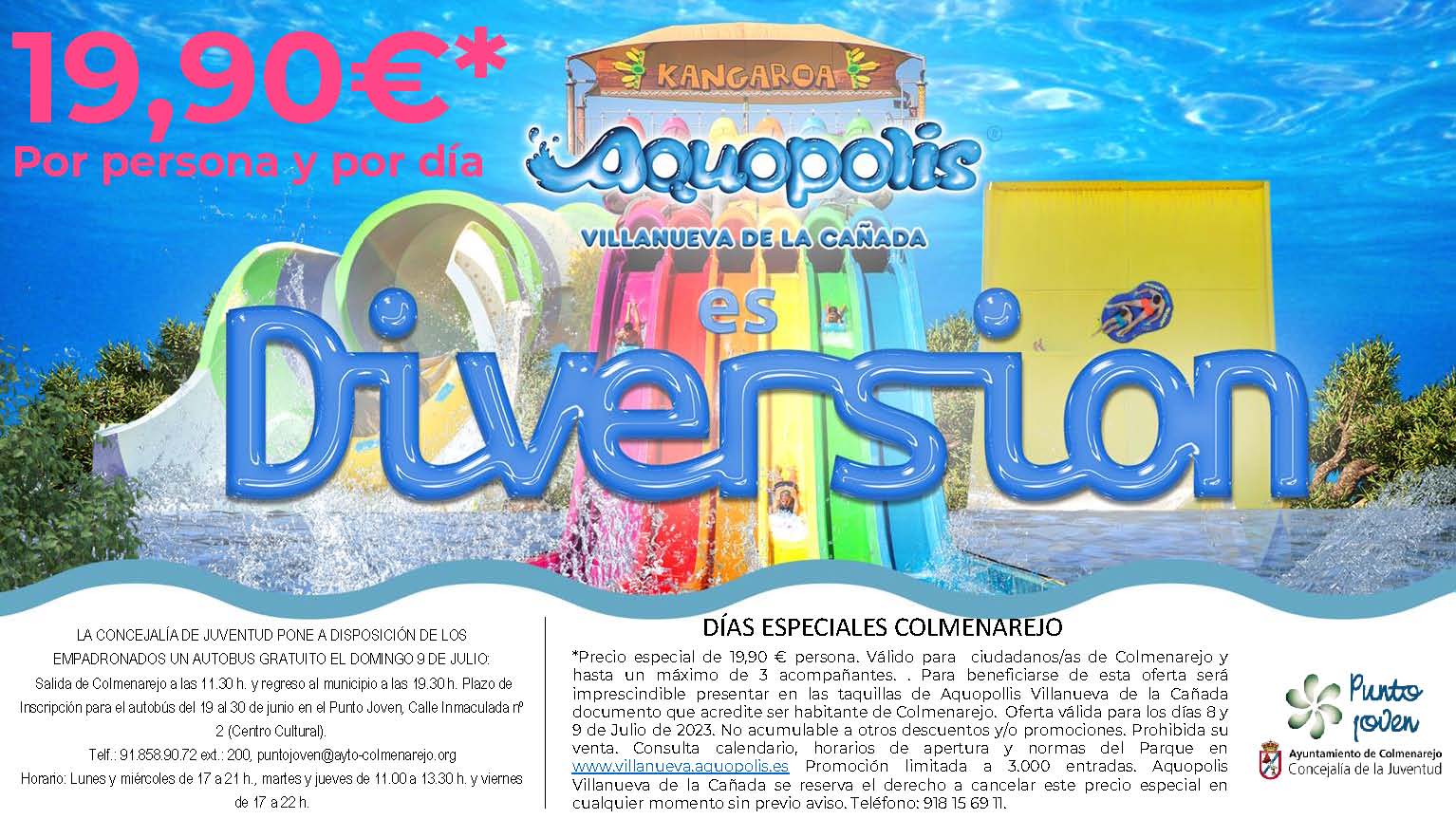 El 8 y 9 de julio será el fin de semana de Colmenarejo en el Aquopolis de Villanueva de la Cañada. El precio de las entradas será de 19.90 € presentando el DNI (precio por persona y día, válido para el titular y tres acompañantes). Sólo tienes que ir a la taquilla del Aquopolis, presentar la documentación y tendrás ese precio especial por ser de Colmenarejo.
