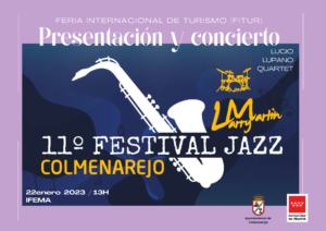 Presentaci贸n de la pr贸xima edici贸n del Festival de Jazz Larry Martin de Colmenarejo en la Feria Internacional de Turismo (FITUR) a celebrar en IFEMA. En esta ocasi贸n va a ser la juventud de los interpretes el nexo com煤n de una programaci贸n que esperamos sea muy especial. Como avance os anunciamos los conciertos a celebrar en el Teatro de Colmenarejo: