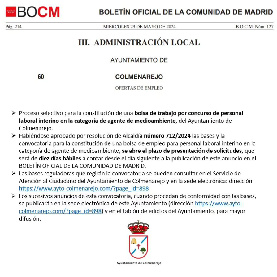 👉🏼Habiéndose aprobado por resolución de Alcaldía número 712/2024 las bases y la convocatoria para la constitución de una bolsa de empleo para personal laboral interino en la categoría de agente de medioambiente, se abre el plazo de presentación de solicitudes, que será de diez días hábiles a contar desde el día siguiente a la publicación de este anuncio en el BOLETÍN OFICIAL DE LA COMUNIDAD DE MADRID.