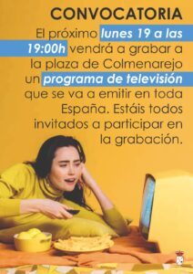El próximo lunes 19 a las 19:00h vendrá a grabar a la plaza de Colmenarejo un programa de televisión que se va a emitir en toda España. Estáis todos invitados a participar en la grabación.
