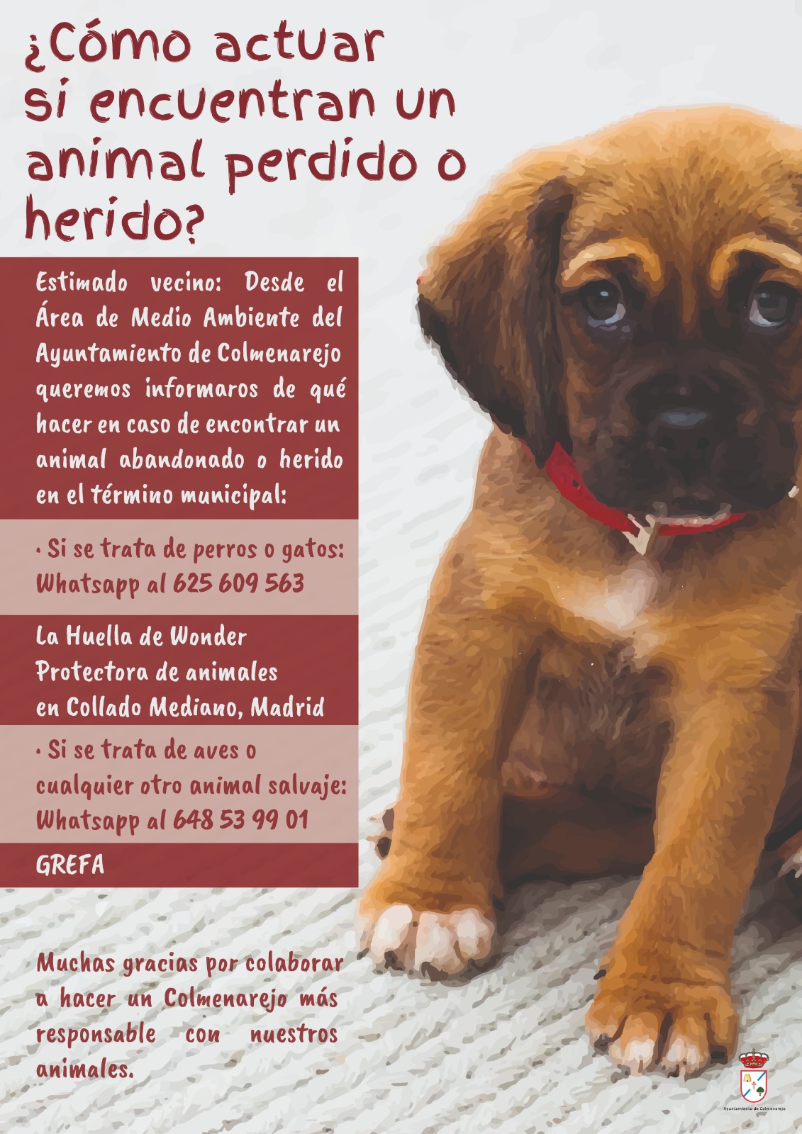 Estimado vecino: Desde el área de Medio Ambiente del Ayuntamiento de Colmenarejo queremos informaros de qué hacer en caso de encontrar un animal abandonado o herido en el término municipal: