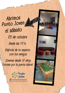 Vuelven los sábados de apertura del Punto Joven. El próximo sábado desde las 17 h. ven con tus amigos al Punto Joven, para jóvenes a partir de 12 años. Entrada por la puerta lateral.