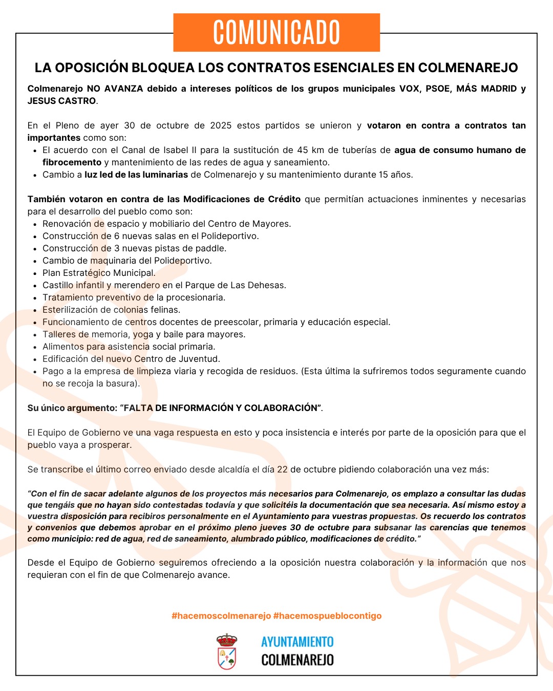 *LA OPOSICIÓN BLOQUEA LOS CONTRATOS ESENCIALES EN COLMENAREJO*