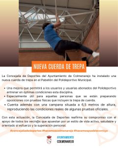 La Concejalía de Deportes del Ayuntamiento de Colmenarejo ha instalado una nueva cuerda de trepa en el Pabellón del Polideportivo Municipal.