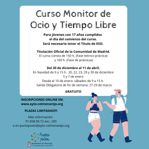 El Punto Joven sigue ofertando formación para jóvenes en nuestro propio municipio. En este caso será el Curso de Monitor de Ocio y Tiempo Libre. Los jóvenes tendrán que tener 17 años cumplidos el día del comienzo del curso y el título de ESO. Se trata de una titulación oficial de la Comunidad de Madrid que consta de 150 h. (fase teórico-práctica) y 160 h. (fase de prácticas). La fase teórico-práctica se llevará a cabo del 20 de diciembre al 11 de abril. Durante la Navidad el 20, 22, 23, 29 y 30 de diciembre y 5 y 7 de enero de 9 a 15 h.. De enero a abril los sábados de 9 a 15 h. y salida obligatoria de fin de semana 27, 28 y 29 de marzo. Las plazas son limitadas y se adjudicarán por orden de inscripción, teniendo prioridad los empadronados en Colmenarejo.