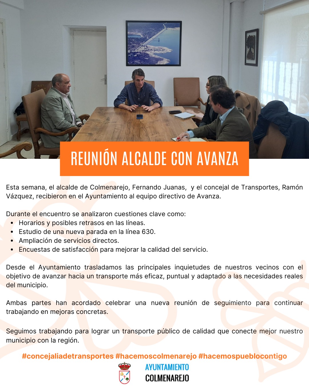 Esta semana, el alcalde de Colmenarejo, Fernando Juanas, y el concejal de Transportes, Ramón Vázquez, recibieron en el Ayuntamiento al equipo directivo de Avanza.
