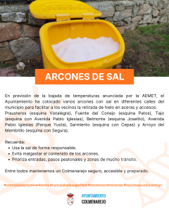 En previsión de la bajada de temperaturas anunciada por la AEMET, el Ayuntamiento ha colocado varios arcones con sal en diferentes calles del municipio para facilitar a los vecinos la retirada de hielo en aceras y accesos: