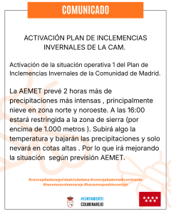 – Activación de la situación operativa 1 del Plan de Inclemencias Invernales de la Comunidad de Madrid.