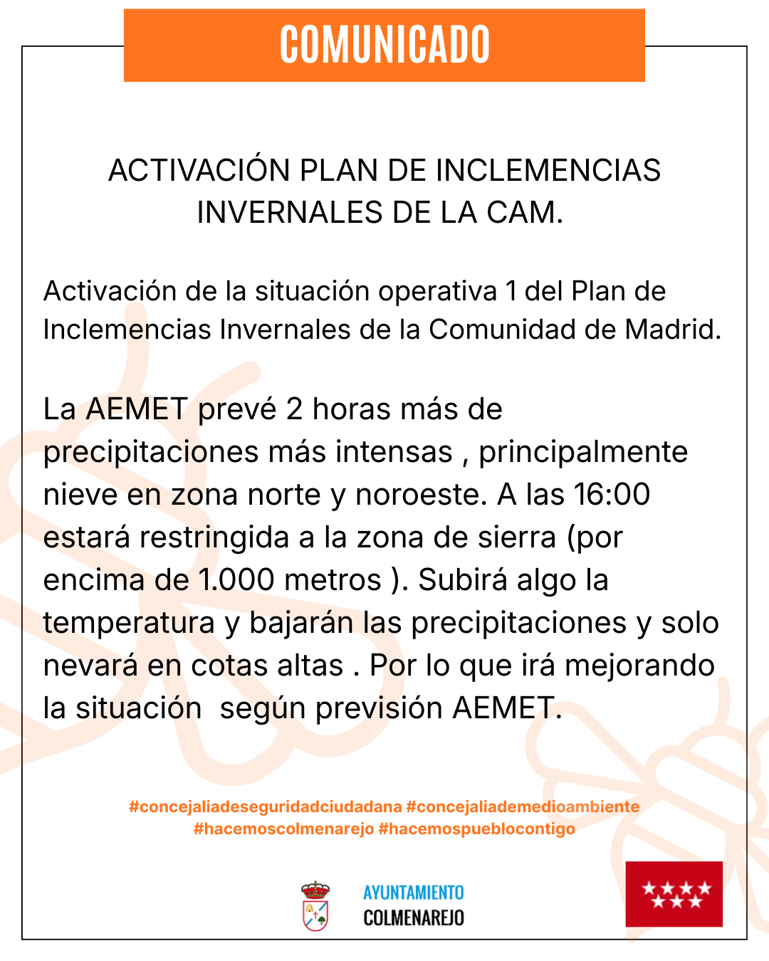 ACTIVACIÓN PLAN DE INCLEMENCIAS INVERNALES DE LA CAM. ⚠️❄️