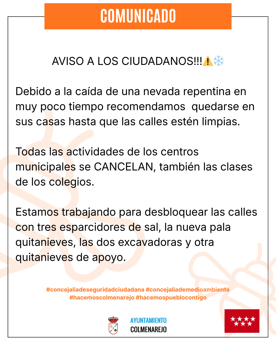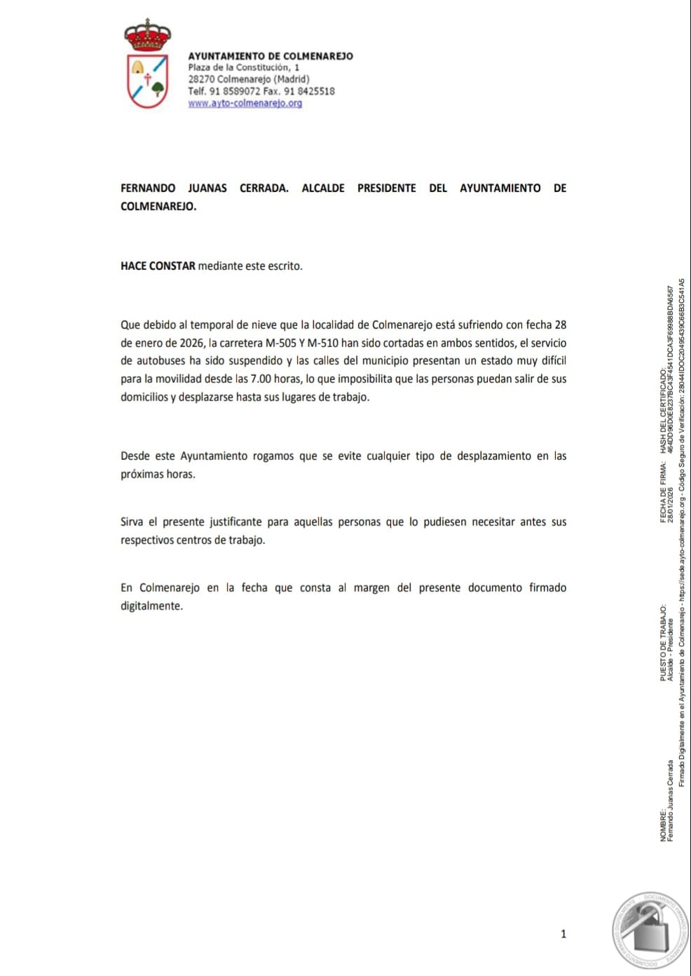 Que debido al temporal de nieve que la localidad de Colmenarejo está sufriendo con fecha 28 de enero de 2026, la carretera M-505 y M-510 han sido cortadas en ambos sentidos, el servicio de autobuses ha sido suspendido y las calles del municipio presentan un estado muy difícil para la movilidad desde las 7.00 horas, lo que imposibilita que las personas puedan salir de sus domicilios y desplazarse hasta sus lugares de trabajo.
