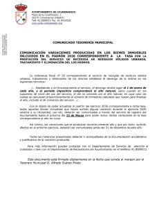 COMUNICACIÓN VARIACIONES PRODUCIDAS EN LOS BIENES INMUEBLES INLCUIDOS EN EL PADRÓN 2026 CORRESPONDIENTE A LA TASA POR LA PRESTACIÓN DEL SERVICIO DE RECOGIDA DE RESIDUOS SÓLIDOS URBANOS, TRATAMIENTO Y ELIMINACIÓN DEL LOS MISMOS.