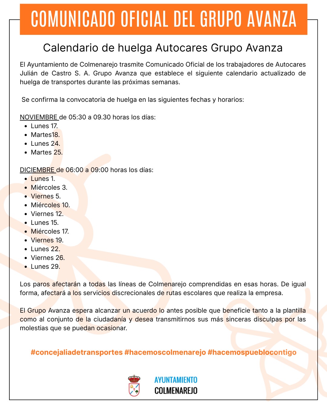 El Ayuntamiento de Colmenarejo trasmite Comunicado Oficial de los trabajadores de Autocares Julián de Castro S. A. Grupo Avanza que establece el siguiente calendario actualizado de huelga de transportes durante las próximas semanas.