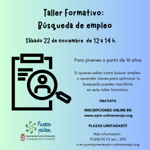 Desde el Punto Joven proponemos a los jóvenes de Colmenarejo otro Taller Formativo en el que se enseñará a buscar empleo o se darán claves para optimizar la búsqueda.  Será el 22 de noviembre de 12 a 14 h. en el Punto Joven y puedes inscribirte AQUÍ